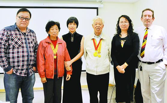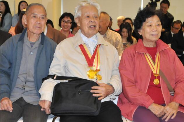 东江纵队港九独立大队老战士林珍、罗竞辉、黄观保(右起)在首映礼上 王岩青 摄