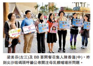 「BB要开餐」召集人油尖区贤毅社主席陈香莲表示,目前香港喂哺母乳空间不足,有不少妈妈特意走上的士,认为是一个较私人的空间,方便喂哺母乳。她指出,现时政府虽有指引,但没有法律效力。如政府的康文设施,或在巴士总站及各港铁站,也没有一个正当的喂哺母乳房间。而本港每年有数万婴儿出生,质疑当局是否要婴儿捱饿,或在卫生环境欠佳的情况下开餐。