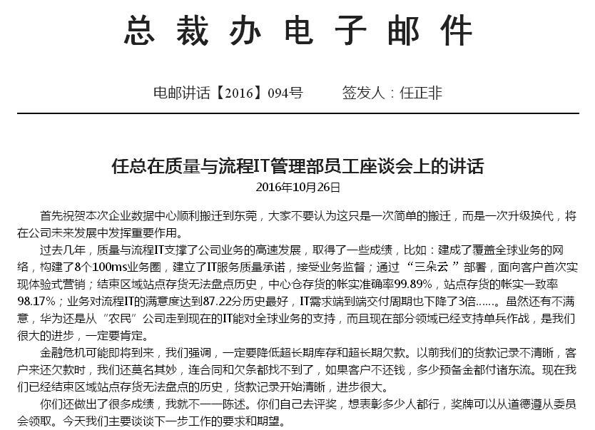 日前,華為以電郵講話【2016】094號文簽發了任正非在質量與流程IT管理部員工座談會上的講話內容,在本次講話中,任正非提醒內部: