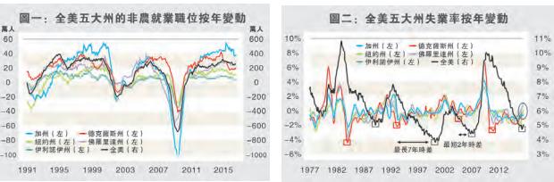 今次筆者從兩大數據包括非農就業新增職位及失業率入手看美國整體就業情况。先看圖一,美國五大州與全美的非農就業職位按年增長基本上都是同升同跌。同時,圖中亦見在全美三大州的加州、德州及紐約州,現時的就業職位增長都已出現明顯跌勢,這在2006年初及1999年間都有類似情况。然而,這些州份的就業職位增長是不是有領先作用呢?也不是,有時會早於全美見頂,有時會遲點,但起碼現時就見三大州的就業職位增長放緩,與坊間所說美國就業情况很好的說法有點出入。