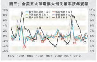 美國制造業開始滑落,造就了特朗普上台,而其刺激經濟的政策亦針對制造業的疲弱情况,這令大家憧憬未來美國經濟及就業市道愈來愈好。筆者也對美國制造業大州做了相同分析,結果也得出類似圖二的結果。筆者同意特朗普需要加大對經濟的支持,但原因不盡是制造業已出現問題,而是可能整個就業市場的增長已達樽頸。故此,明年整個美國就業市道不可過於樂觀。特朗普當選后大家熱炒其經濟政策可推升通脹及就業,憧憬美國經濟仍會一如以往地復蘇。不過,事實是否真的如此?來年看看。