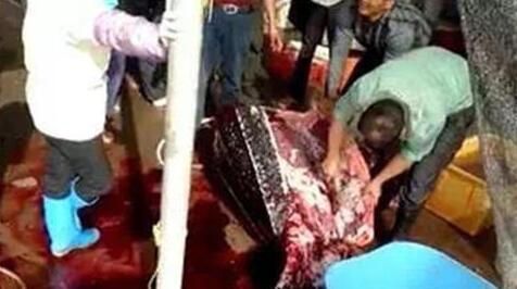 屠夫用尖刀切割龟肉,现场血流成河,十分惨烈。据了解,该只棱皮龟重约416斤,龟壳形状像船板,是国家二级保护动物。据村民透露,这只海龟被渔民以70元每斤的价格出售。当日下午4时许,已被一抢而光,卖家估计可收入20000余元。