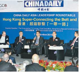 梁振英昨日在《中國日報》舉辦的「香港:超級聯繫一帶一路」論壇(圖)上稱,「一帶一路」倡議的核心在於促進人與人之間以及不同市場之間的聯繫和發展,本港在這些領域都可以扮演關鍵角色,因為本港正是「超級聯繫人」,為內地和世界搭建了聯繫的橋梁。