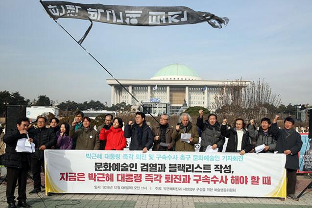 8日晚,首爾下起大雨。穿著雨衣,打著雨傘,韓國數千民眾聚集在國會門前,要求“總統立即下臺”“國會通過彈劾”。當天,首爾大學791名教授舉行記者會要求國會全票通過彈劾案。樸槿惠的母校西江大學1121名學生發表時局宣言,要求國會行使憲法賦予的職權對總統進行彈劾。韓國各大主要工會也紛紛發聲明,要求國會議員順應民意,有組織還警告將對導致彈劾案流產的政治人物進行問責。首爾大學教授韓寅燮在臉譜上呼吁,“韓國全國各地的國民,讓我們乘坐農用車、叉車和大巴等,將國會和汝矣島整體包圍進行靜坐示威。讓我們將鼓、喇叭、嗚嗚祖拉、哨子、小號、鍋等家中發聲最亮的物件統統拿上,在12月9日的彈劾之日逼近國會,為其帶來一場天崩地裂般的巨響”。