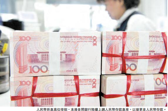 為搶人民幣資金,本港銀行多間銀行再度掀起人民幣定存息戰,戰況雖然未如9月份那樣激烈,但息率仍然高達4厘,而且本周一、二短短兩日就有7間銀行上調人民幣存息。
