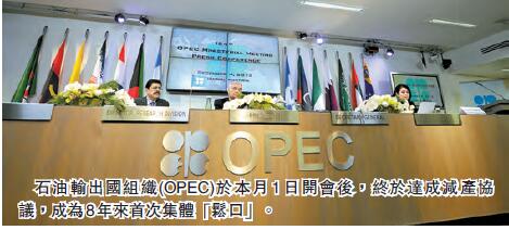 油組成員一致同意明年1月起,日均減產約120萬桶原油,協議為期6個月,明年5月再開會,檢討執行情況,決定是否延長協議至明年底。與此同時,非油組產油國俄羅斯亦附贈了一個大彩蛋,聲明亦加入減產行動當中。