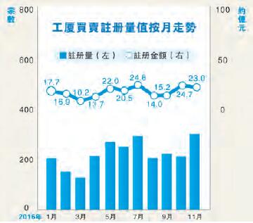 【香港商報網訊】記者莊海源報道:根據美聯工商舖資料研究部綜合土地註冊處數據顯示,11月份市場共錄299宗工廈買賣註冊成交,按月大增40%;但註冊總值按月下跌7%至約22.97億元。美聯工商董事陳偉志表示,在近期工廈拆售項目帶動下,工廈市場交投氣氛不俗,刺激工廈買賣註冊量攀升至接近300宗水平,創出近13個月新高紀錄。