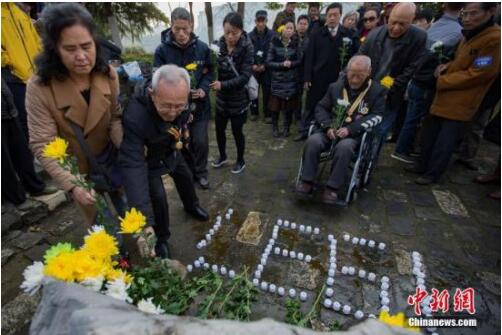 2016年12月12日,在第三個國家公祭日來臨之際,參加過1937年南京保衛戰的抗戰老兵、侵華日軍南京大屠殺遇難者家屬、南京1213志愿者聯合會的志愿者們來到南京光華門遺址公園,向這片曾經發生過激烈戰斗的陣地獻上和平歲月里的悼念菊花。 中新社記者泱波攝