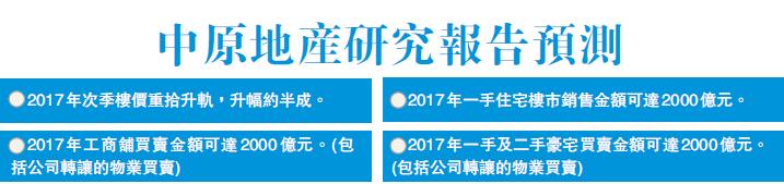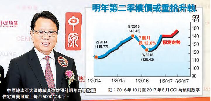 中原地產亞太區總裁黃偉雄則認為,政府上月初「加辣」只能短暫煞停上升中的樓價,卻未能解決問題。樓市剛性需求不變下,業主和發展商卻被迫暫停售樓,造成短時間供不應求,反為樓價製造上升的壓力。新辣招推出後,中原城市領先指數CCI重返歷史高位(143點)後橫行,預計2017年次季重拾升軌。至於成交量方面,黃偉雄料,預計2017年次季才可以恢復,由新辣招後每月3000宗重上每月5000宗水平。