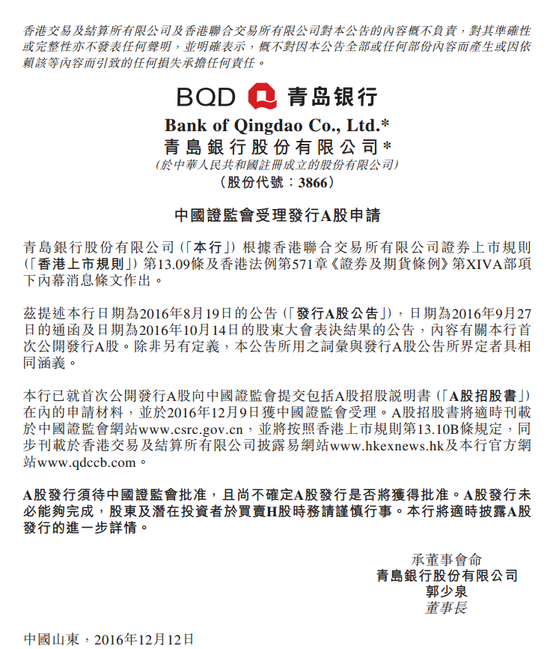 青島銀行12月12日在港交所公告,該行已就首次公開發行A股向中國證監會提交包括A股招股說明書在內的申請材料,并于12月9日獲證監會受理。