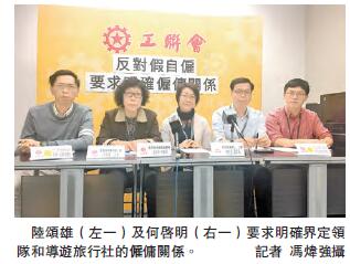 香港旅游业雇员总会理事长梁芳远表示,包括导游及领队等从业员依循雇主,即旅行社的指示和行程安排履行职责,但却被视为自雇人士。但不少从业员连劳工保险都没有,亦有外游领队在工作期间受伤亦无法索偿。她指,政府没有明确旅行社和导游及领队之间的雇佣关系恐怕令「假自雇」情况持续。