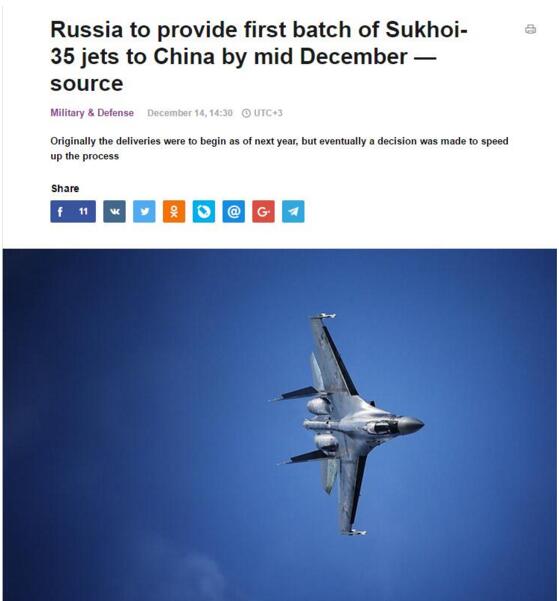 塔斯社引述的消息人士說:“首批4架蘇-35戰斗機將于12月25日飛往中國。”