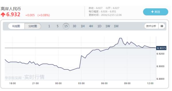 離岸人民幣現報 6.932。可以看到,離岸人民幣自凌晨3:00前后開始經歷一波上漲后,走勢逐漸平穩。
