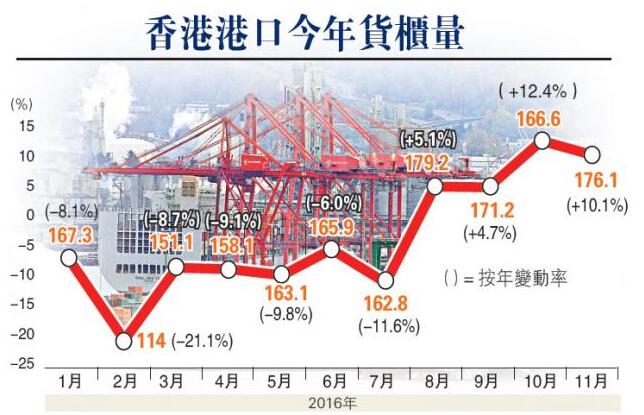 香港海運港口局公布,上月香港港口吞吐量按年增長10.1%至176.1萬箱,為連續第四個月錄得升幅;當中葵青貨櫃碼頭吞吐量更是自2014年4月以來首次錄得雙位數升幅。累計今年首11個月,香港港口吞吐量跌4%至1775.5萬箱,環比跌幅進一步收窄。香港貨櫃碼頭商會主席鍾惠賢表示,吞吐量上升,主要是由於有個別船公司航線服務回流香港。/大公報記者 林靜文