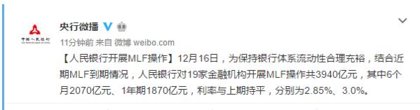 為保持銀行體系流動性合理充裕,結合近期MLF到期情況,今日央行對19家金融機構開展MLF操作共3940億元,其中6個月2070億元、1年期1870億元,利率與上期持平,分別為2.85%、3.0%。此外,今日沒有MLF到期。