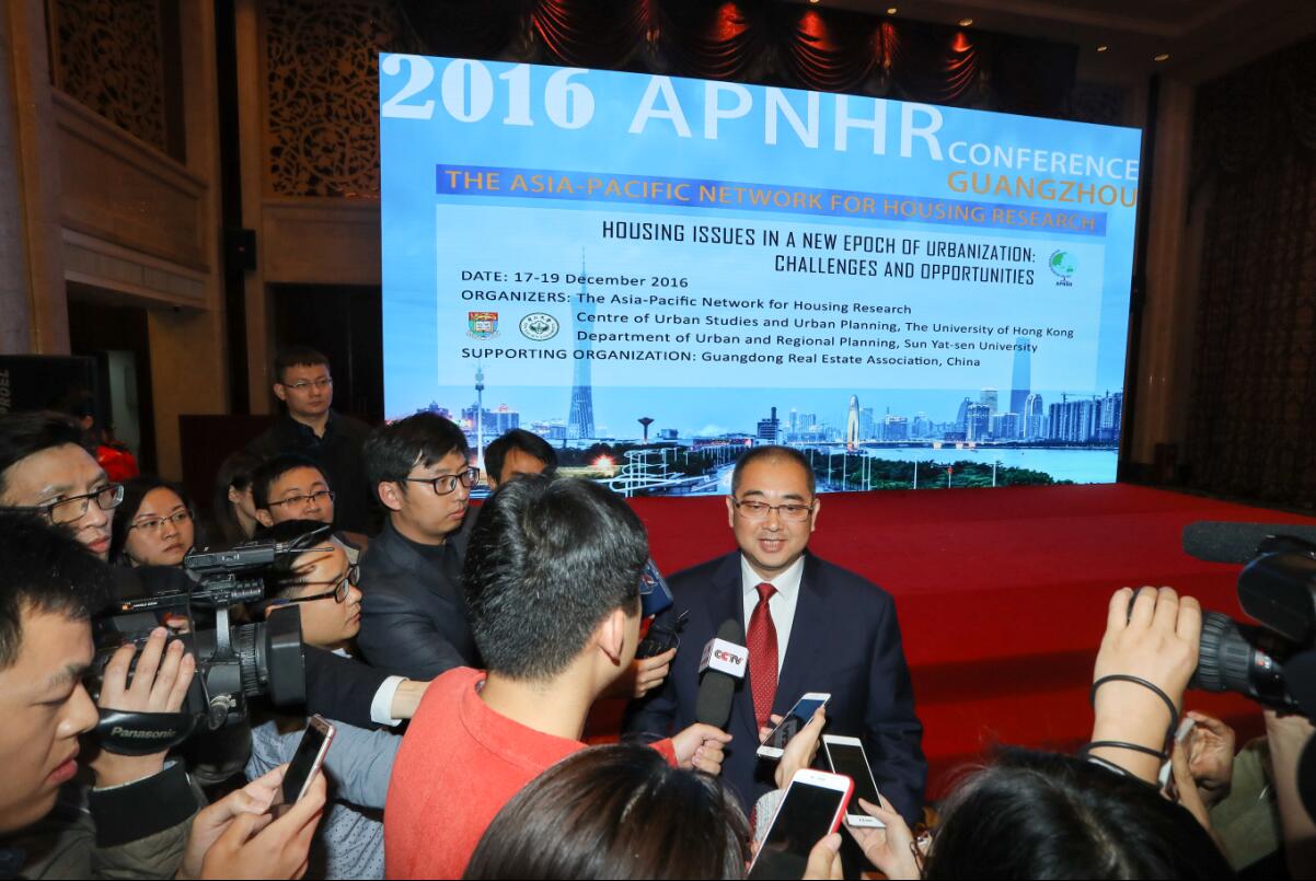 恒大集团总裁夏海钧在亚太住房联盟国际研讨会议间隙接受场媒体采访。