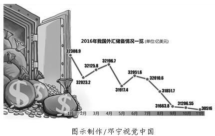 截至2016年11月30日,我國外匯儲備規模為3.05萬億美元,較10月底下降691億美元,降幅為2.2%。這是外匯儲備連續第五個月規模減小,并創今年1月以來最大降幅。