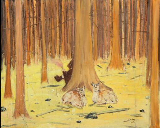 在薛揚的繪畫中,經常會出現一個穿梭在森林、山間甚至冰川之上舉著火把獨自行走的孩子。對於薛揚而言,森林、冰川包括孩子似乎都是一些符號,帶著哲學訴求與詩性的隱喻。在唯一被認為恒久的存在即時間中,尋找對她是一個喋喋不休的過程,在由生到死的漫長旅程中,所有人都在磕磕碰碰地走著,無先跡可尋,如果蒼穹之上真有一雙智慧的眼睛,我們沒有人不是一個孩子,走在黑暗的森林裏我們恍若步入迷宮,舉著火把小心謹慎地探路前行!柏拉圖說“這是一條令人困惑的路,沒有可供循跡的線索。然而,若你在它的中心不被其吞噬的話,盡管百轉千回,它的確可以通回起點”,我想,薛揚如此堅定想要尋找的大體就是一種希冀之光,就像埃裏克·侯麥的電影《綠光》中所描繪的期待,在冗長的絮絮叨叨的日常敘事後,在影片最後的2分鍾,主人翁見到綠光的瞬間歡呼裏,生命突然綻放出華彩的希望之光。