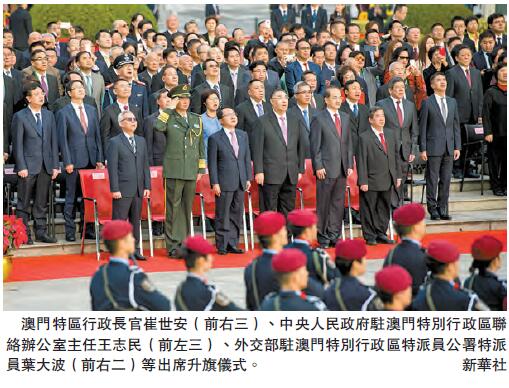 【香港商報訊】記者周偉立報道:昨日是澳門回歸17周年紀念日。澳門特區政府早上舉行升旗禮及慶祝酒會。澳門行政長官崔世安致辭時指出,當前澳門的穩定發展局面,離不開中央對澳門的支持,更離不開憲法和《基本法》的堅實保障,要繼續發揮一國兩制的制度優勢,并審視改進工作中存在的不足,積極有為;并將參與「一帶一路」建設確定為澳門的發展戰略。