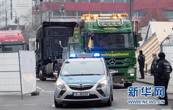 法新社/新華社12月20日,在德國柏林,沖入圣誕集市的貨車(后)被拖走。法新社/新華社