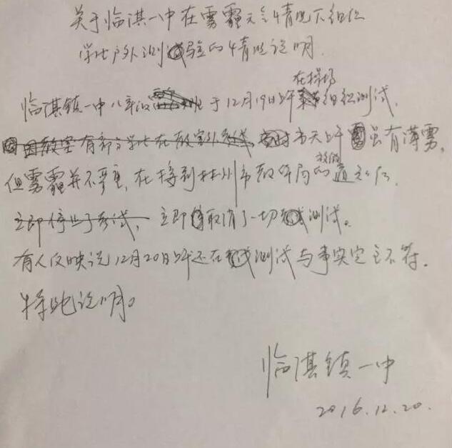 馮校長出示了一份手寫的情況說明:臨淇鎮一中八年級于12月19日上午在操場組織測試,當天上午雖有薄霧,但霧霾并不嚴重,在接到林州市教體局的通知后立即取消了一切測試。有人反映說12月20日上午還在測試,與事實完全不符。特此說明。“為什么有學生說19日下午也考試了?”記者追問,并說出了考試的科目。馮校長尷尬地笑笑:“組織都組織了,就考完吧。”據馮校長介紹,當時并沒有這么多學生在操場考試,有一部分學生在教室考的,在操場上考試的只有480多名學生。到底是什么樣的考試如此急迫,讓學生頂著霧霾也要進行?馮校長說,學生課講完了,這次考試是一個摸底測驗考試,也沒有那么急迫。