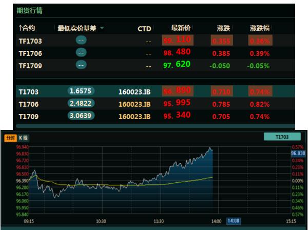 國債期貨午后擴大漲幅,10年期國債期貨主力合約T1703現漲約0.8%至96.94,創八個交易日來新高。5年期國債期貨漲0.36%。