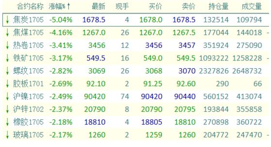截止目前,焦炭跌5%,焦煤跌4%,螺紋鋼、鐵礦石跌近3%。