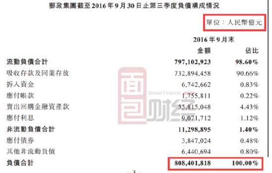 公告主要內容是:披露了控股股東郵政集團截至今年9月30日的“身家”。營收2570億元,凈利潤409.7億元,雖然金額不低,但考慮到郵政集團家大業大,也還在接受范疇之內。然而在公司負債這一項,郵儲銀行做出一個大轉折:披露郵政集團負債808401818億,數字太多了,簡單的說就是負債8億億。按照這個數字,以去年中國67.67萬億GDP計算,全國人民一起努力1000多年也沒有辦法幫郵政集團還清債。