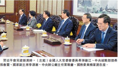 全國人大常委會委員長張德江、中央統戰部部長孫春蘭、國家副主席李源潮、中央辦公廳主任栗戰書、國務委員楊潔篪參加會見。