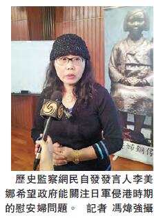 今年是香港淪陷75周年,李美娜指政府卻沒有大型紀念活動。她表示,75年前的12月24日,日軍進入香港強姦婦女,翌年不少被強暴所誕下的嬰兒出生,令該年出現不尋常出生率。李美娜又指,當時灣仔一帶亦有不少的慰安所,大批香港女性飽受日軍摧殘,她估計日軍侵港期間,受日軍性侵的香港女性高達1萬人,認為情況值得社會重視。