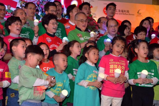 圖:張建宗出席兒童發展配對基金舉辦的聖誕頌歌節,與小朋友一起唱出聖誕歌曲(勞福局網頁)