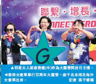 香港女童軍總會舉辦的「香港女童軍百年童創新紀元國際大露營」,在本月25及26日設有開放日,吸引超過3,000名女童軍及其家人朋友出席。大露營在昨日的開放日儀式中,由梁唐青儀會長擔任主禮嘉賓,并與女童軍香港總監李周美枝、副會長梁王培芳、及名譽副會長陳明耀等嘉賓主持啟動禮。主禮嘉賓團於啟動禮后於營內各處參觀,出席嘉賓還包括香港女童軍總會各地方協會分會及其他香港青少年制服團體代表等。