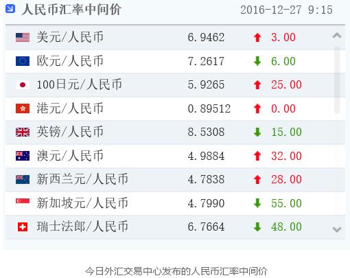 新浪財經訊 12月27日消息,早間外匯交易中心發布公告,人民幣(6.9494, 0.0015, 0.02%)匯率中間價報6.9462,較前一交易日小幅貶值3個基點。