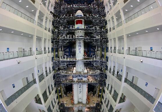 这是位于海南文昌航天发射场垂直总装测试厂房中的长征七号运载火箭(6月17日摄)。