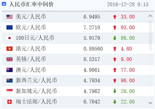 新浪財經訊 12月28日消息,早間外匯交易中心發布公告,人民幣(6.9546, 0.0056, 0.08%)匯率中間價報6.9495,較前一交易日貶值33個基點,再度逼近6.95關口。