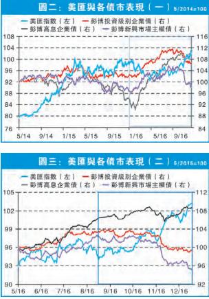 圖一見到,近年美債都處於大牛市,連帶其他如新興市場主權債及企業債等都極受投資者歡迎。無他,環球央行皆大幅放水,資金氾濫下令投資者追逐高息資產,債市便成為各方游資的其中一個重要落腳地。看看圖二,由2014年5月美匯開始炒收水而急升開始至今,無論投資級別或高息企業債,以至新興市場債表現都相當不俗,見到債市投資真的不怕聯儲局的收水加息。若果明年聯儲局仍加息的話,這類債仍可買嗎?