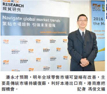 【香港商報網訊】記者莊海源報道:貿發局發表全球年末銷售報告指出,今年聖誕節個別傳統及新興市場銷售表現理想,其中美國銷售按年增長約4%,英國及德國銷售分別上升約4%及超過3%以上。貿發局環球市場首席經濟師潘永才預期,2017年全球零售市場可望略有改善,主要是傳統市場持續復蘇,利好本港出口商,港商應把握機會。