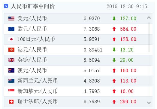新浪財經訊 12月30日消息,早間外匯交易中心發布公告,人民幣(6.9446, -0.0088, -0.13%)匯率中間價報6.9370 ,較前一交易日大幅升值127個基點。