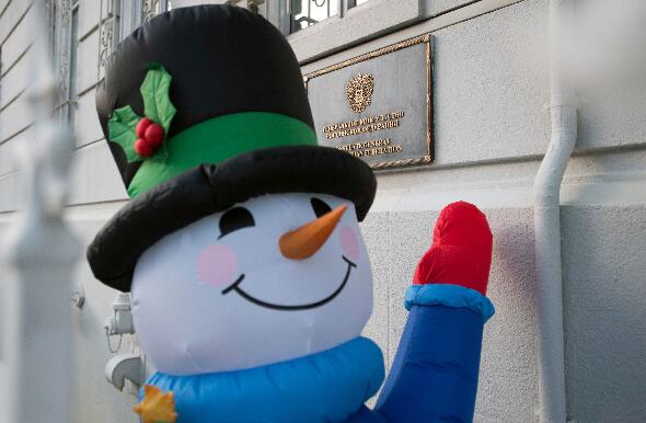 12月29日,在美国加利福尼亚州旧金山,一个充气雪人模型竖立在俄罗斯驻旧金山领事馆前。