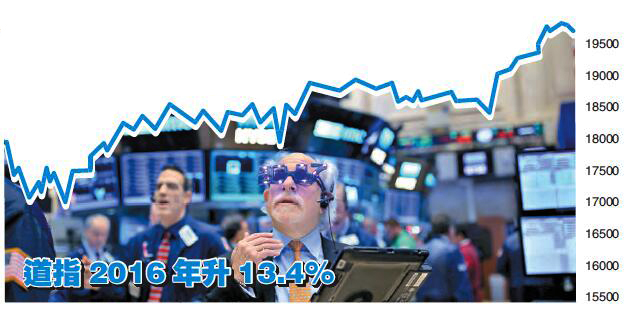截至12月30日收市,道指比前一交易日下跌57.18點,收報19762.6點;標普500指數跌10.43點,收報2238.83點;納指跌48.97點,收報5383.12點。累計全星期,道指跌0.9%,標普指跌1.1%,納指跌1.5%。以12月計,道指升3.3%,標指升1.8%,納指升1.1%。而以2016年計算,道指升13.4%,標普500指數升9.5%,納指升7.5%。反映中小型企業表現的羅素2000指數更是全年升19.4%。