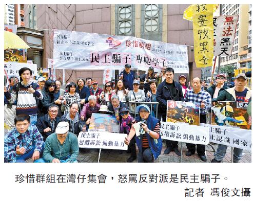 愛港團體「珍惜群組」昨午在灣仔軒尼詩道集會,發起人李璧而指反對派經常對國家說三道四,阻礙學生認識祖國,又教唆年輕一輩用激烈手法抗爭,并提供法律顧問,令他們有恃無恐,認為反對派是挂着民主旗號的騙子,所以特意在游行期間集會,期望帶出另一種觀點。