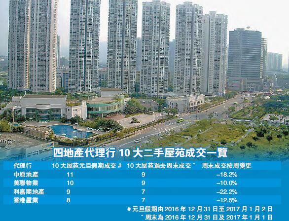 【香港商報網訊】記者曾浩榮報道:2017年伊始,節日氣氛仍籠罩香港樓市,加上欠缺焦點新盤及二手盤源趨缺,全港整體成交未見「回勇」。綜合4間代理行數據,元旦假期3日(2016年12月31日至2017年1月2日),各行於全港10大指標屋苑成交個案僅介乎8至11伙(各行屋苑成員不盡相同),與上個周末(2016年12月24日至25日)水平差不多。就今年樓市走勢,業界普遍預期,在樓市調控措施限制下,市場購買力會聚焦新盤。