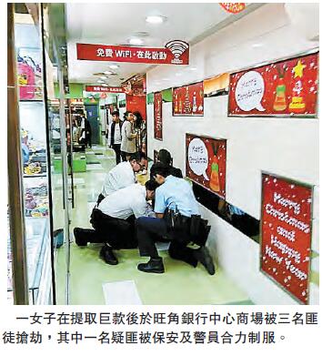 【香港商報网訊】記者萬家成報道:旺角銀行中心商場發生搶劫案。一名花甲女商人提取巨款后被3名匪徒截劫,遭搶走載有數十萬元的手袋。其中1名「烏龍」疑匪竟不懂逃離商場,最終被趕至保安員及警員合力制服拘捕。經點算后女事主僅損失港幣7萬元,乃不幸中之大幸。