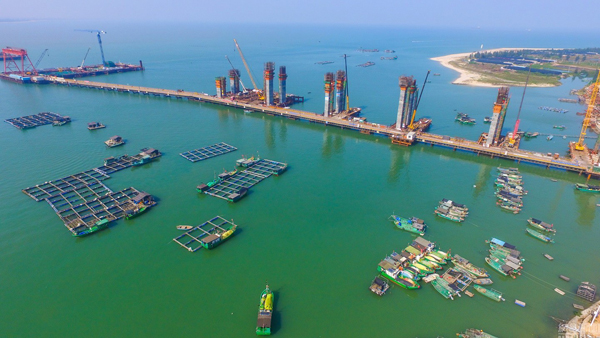2017年1月3日,海南海口,高空鸟瞰海南省迄今为止规模最大的独立跨海桥梁工程——铺前大桥工程。据了解,海南铺前跨海大桥横跨海南岛东北部的铺前湾海域,项目起点与文昌滨海旅游公路相接,终点与海口江东大道二期工程相接,大桥连接文昌市铺前镇和海口市演丰镇,是文昌木兰湾规划区与海口江东组团对接的关键节点工程。项目路线总长5.597公里,项目批复总投资约30.149亿,建设工期48个月。图/东方IC