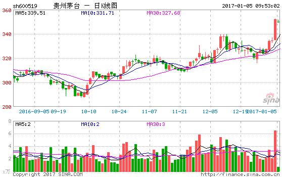 受上述該利好消息的影響,公司的股價也一路上揚,交易行情顯示,自2016年12月26日—2017年1月4日7個交易日期間,貴州茅臺總共成交20.6萬手,成交金額高達68.6億元,漲幅為9.96%,在此期間,大盤的漲幅為1.56%,由此可見,貴州茅臺明顯跑贏大盤。