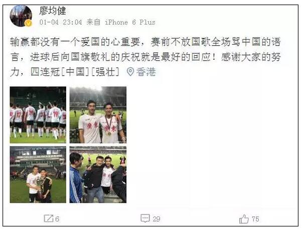 同为广东队球员的廖均健,也在微博发文:“输赢都没有一个爱国的心重要”,“进球后向国旗敬礼的庆祝就是最好的回应”。