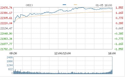 港股2017年首日紅盤高收,昨日下跌,恒生指數今早高開0.23%,開盤后漲幅擴大,全天最高漲逾300點,高見22483點,逼近50天線(約22497點),創逾三周新高。截止收盤,恒生指數漲1.46%,報22456.69點;國企指數漲1.67%,報9598.68點;紅籌指數漲1.17%,報3653.38點。大市成交額646.39億。