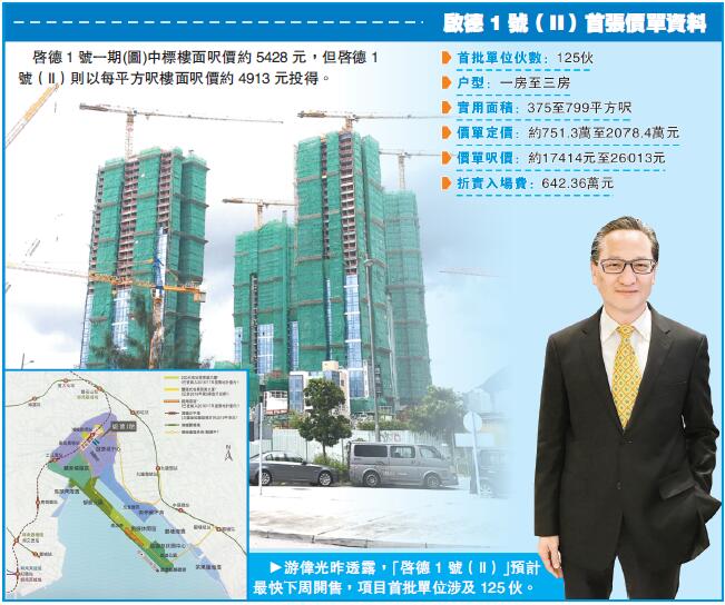 中國海外地產董事總經理游偉光昨於記者會上透露,「啟德1號(II)」預計最快下周開售,項目首批單位涉及125伙,戶形涵蓋一房至三房,價單尺價介乎17414元至26013元,扣除買家最高享有的14.5%優惠后,折實尺價介乎約14889元至22240元,較同系首期第四張價單的均價加幅少於5%。
