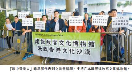 另外,民間團體「政中香港人」昨早派代表到立法會請願,支持在本港興建故宮文化博物館。發言人林偉康說,社會不應將事件政治化,或以意識形態之爭蓋過事件的本質。