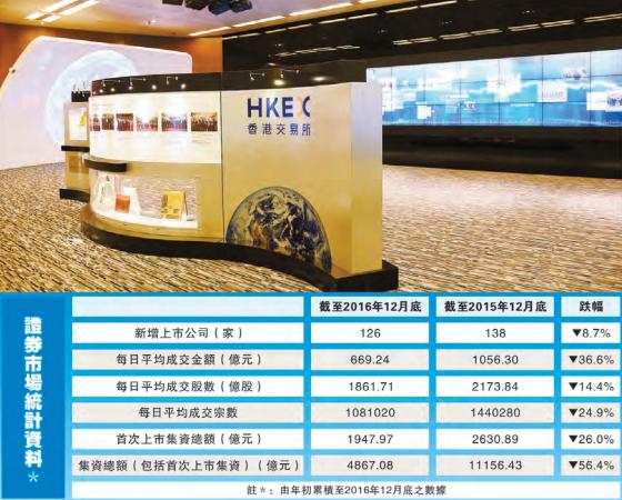 2016年,共有126家新上市公司,較2015年的138家下跌9%;首次公開招股集資金額為1948億元,按年下跌26%。去年包括首次上市集資在內的集資總額為4867億元,按年大幅下跌56.4%。衍生產品市場方面,2016年的期貨及期權平均每日成交量為761744張合約,較2015年的768520張下跌1%。2016年的股市指數期貨平均每日成交量為337247張合約,較2015年的293178張上升15%。2016年的股市指數期權平均每日成交量為123354張合約,較2015年的96756張上升27%。